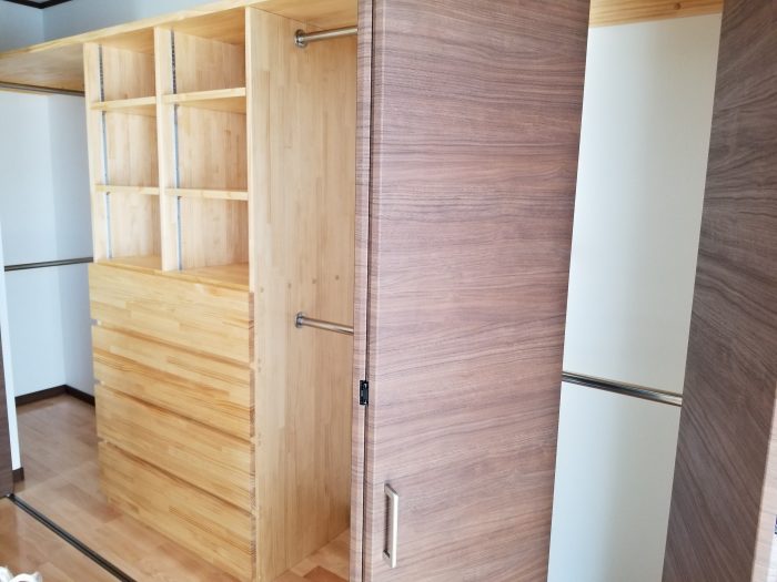 クロ-ク内の収納は施主様のご希望のサイズで、すべて弊社の職人の手作りで施工させていただきました。