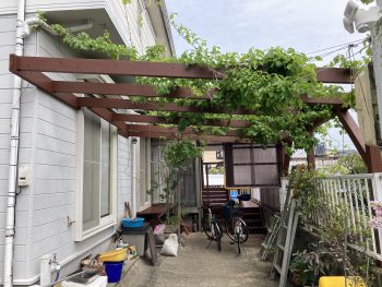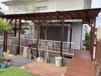 ウッドデッキ施工を行いました。 奥側の桜の木をそのまま残しながら、広々としたウッドデッキが完成しました。 さらにスロープをつけたのでワンちゃんも楽に昇降できます。 外に出るのが楽しくなるウッドデッキが完成しました